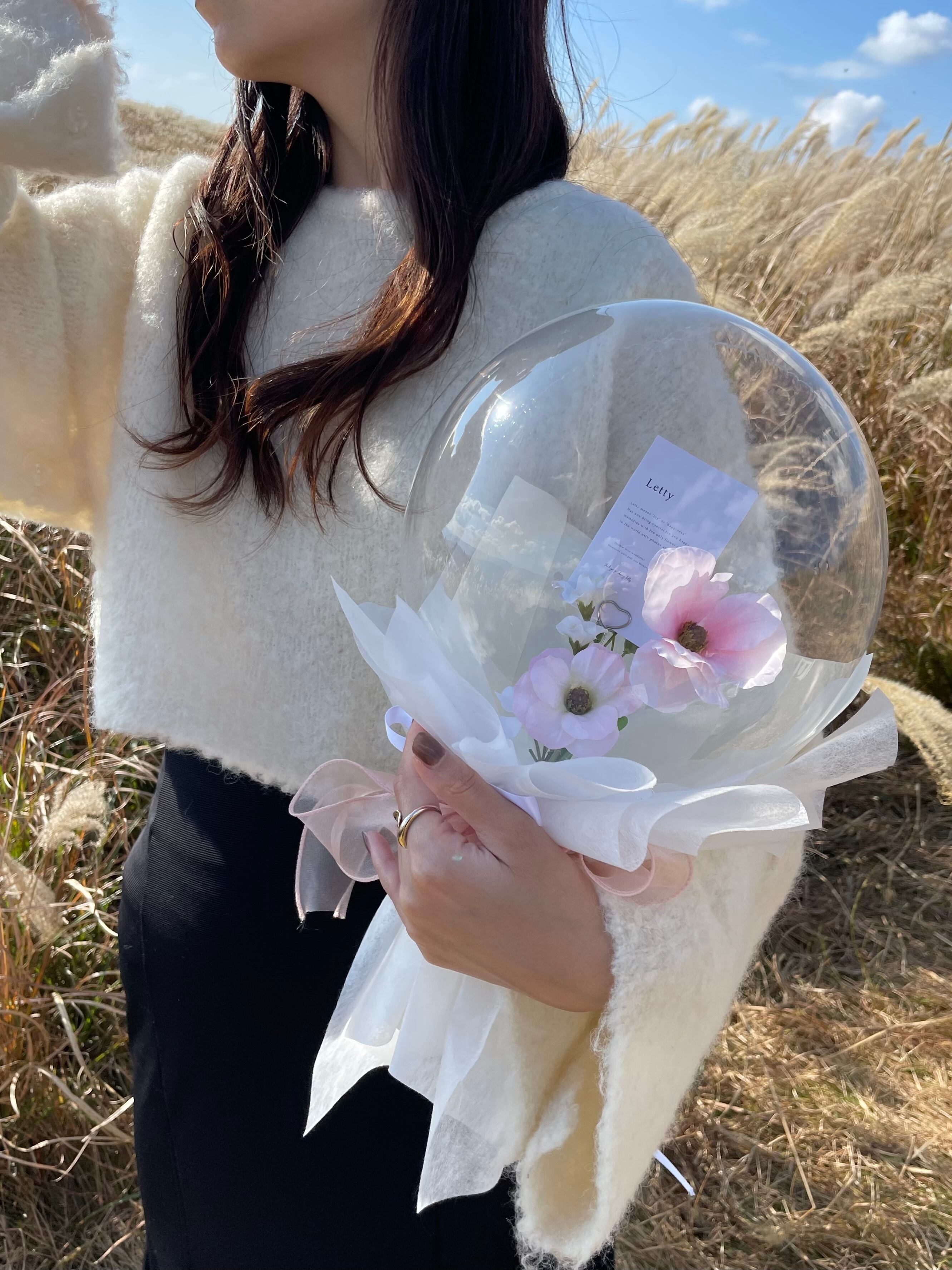 コロンとしたピンクのお花とメッセージカードが入ったブーケタイプのバルーンフラワー♡