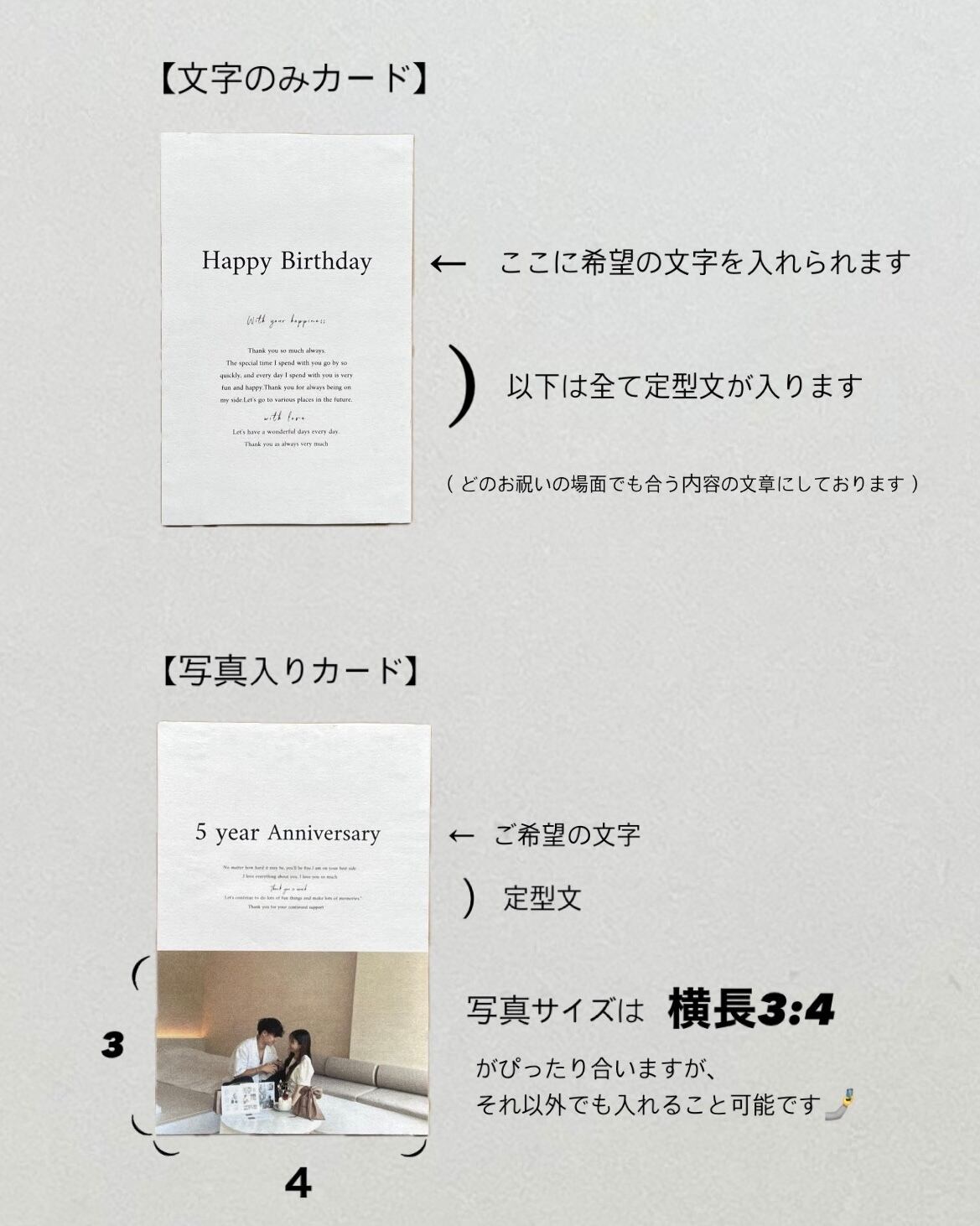 ②『写真入りカード』(文字+写真)付けることができます。